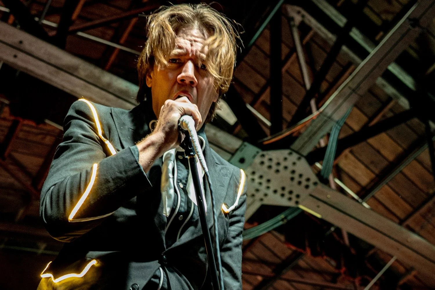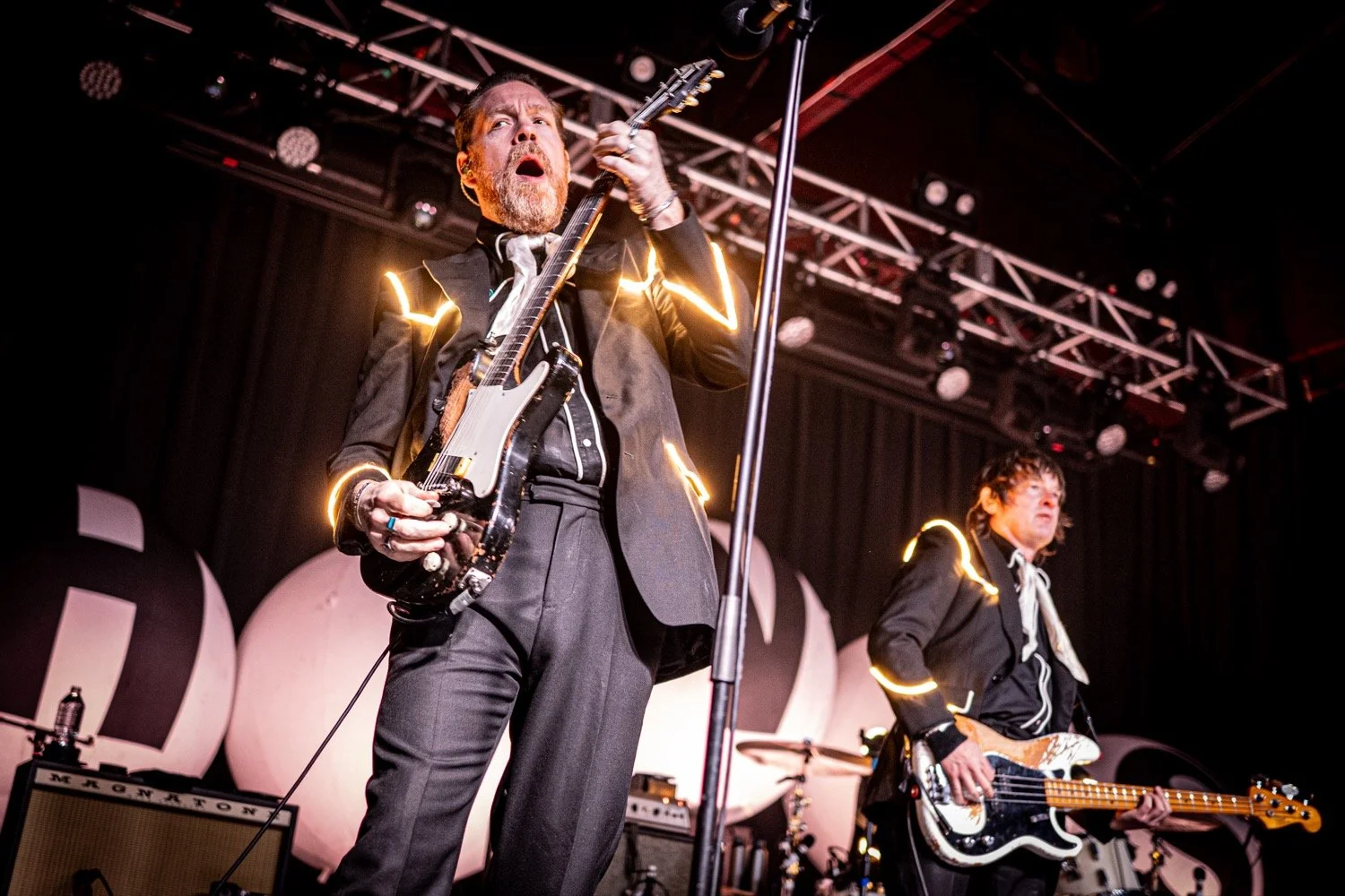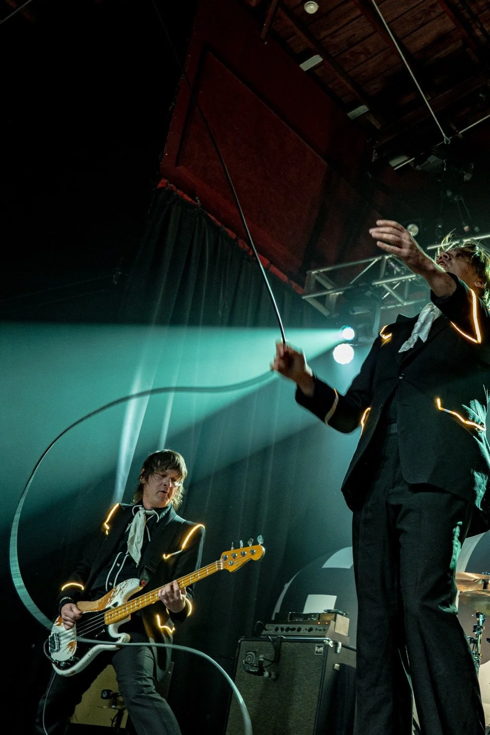 Built for stadiums and arenas, The Hives' performance translated nicely to the thousand-cap room, more than delivering on the potential of seeing world-class artistry in an intimate setting. Donning their usual black suits with glow-light piping, the group followed the example of frontman Pelle Almqvist, whose stage strutting, corded-mic tossing, and frequent pleas for more noise by waving his arms — requests that were fulfilled every time — provided consistently captivating visuals.