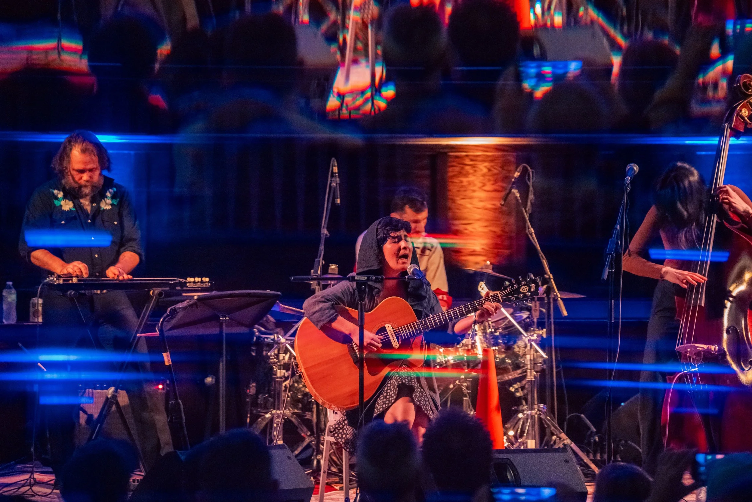 As advertised, the band launched into an Ennio Morricone-inspired instrumental groove, layering iconic Hollywood atmospherics with an ominous, rumbling undercurrent. Imagine surf rock relocated inland from the California coast and injected with the surrealism of the American Southwest. From there, Lazyhorse’s cinematic opus would expand to incorporate haunting vocal harmonies by two remarkable frontwomen, Mali Obomsawin and Miriam Elhajli; widescreen soundscapes delivered with expert musicianship by Chacon and his band; evocations of American mythology and the violence of the Western frontier; and a thread of subversive performance art, making provocative use of religious sacraments on the church’s altar/stage. Suffice to say, Lazyhorse is a wildly original project brimming with big ideas.