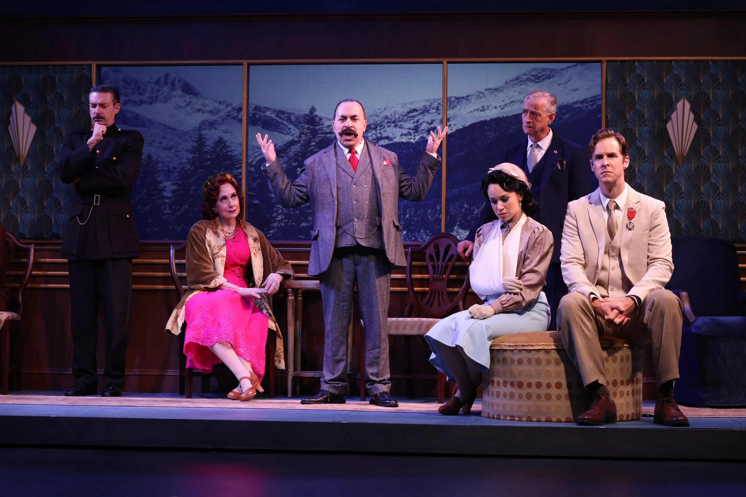 Scenes from Murder on the Orient Express at Flat Rock Playhouse, featuring cast members (from left) Laura Jordan, Scott Treadway, Betsy Bisson, Maddie Franke, and Steven Rattazzi.